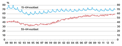 Varsinkin 60–64-vuotiaiden työllisyysaste on lamavuodesta 1994 lähtien koko ajan kasvanut. Silloin 60–64-vuotiaista oli työllisiä 17 prosenttia, tänä vuonna luku on jo 44 prosenttia.